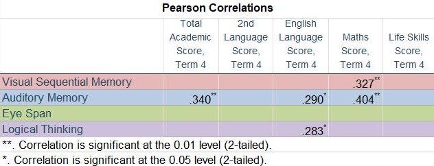 The Eye-span subtest, which measures iconic memory, most likely did not correlate with any school subject as iconic memory is a cognitive skill required mainly for reading, and none of the school subjects rely exclusively on reading. English language grades, for example, are also dependent on spelling, writing, handwriting, and oral ability. The same type of reasoning probably applies to the Visual Sequential Memory subtest, which correlated with math grades but not with English language as a whole.