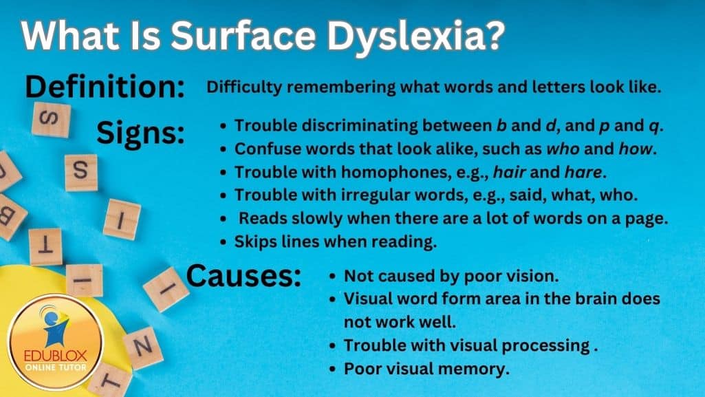 Surface dyslexia is a specific form of dyslexia that refers to individuals who struggle with whole-word recognition and irregularly spelled words. In this article, we discuss what surface dyslexia looks like, how it differs from other dyslexia types, and its causes.