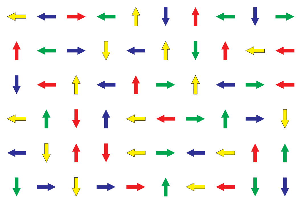 The student must now call out the color of every red and yellow arrow but the direction of every green and blue arrow, simultaneously pushing out their fist(s) when “reading” the green and blue arrows.