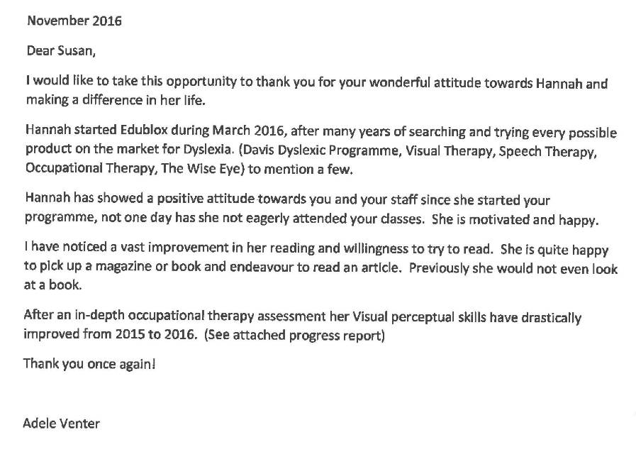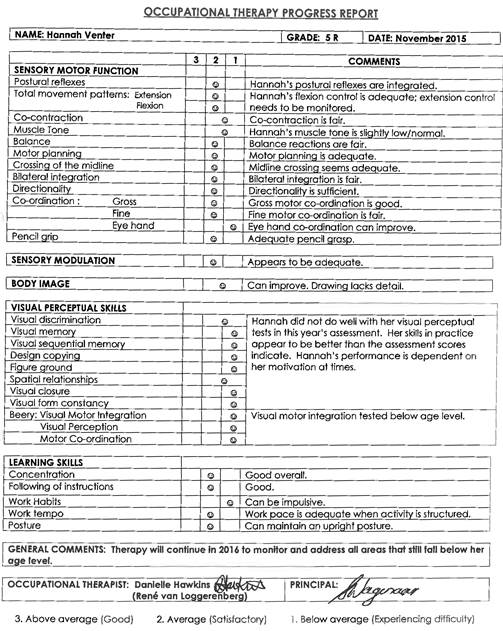 The assessment below is Hannah’s occupational therapy progress report dated November 2016, nine months after starting at Edublox. She has made “excellent and pleasing improvement in areas of sensory motor function as well as visual perception.”