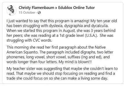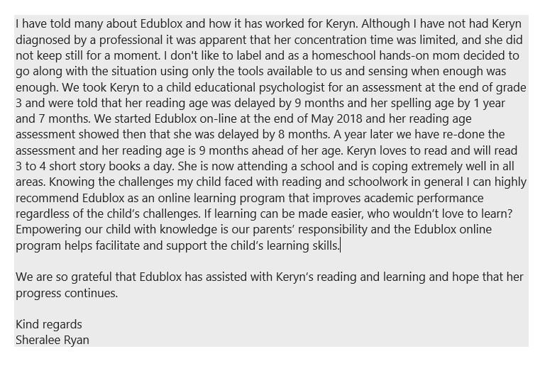 Edublox has literally changed our lives and I tell everyone I can who is struggling, to try it. Thank you a million times.