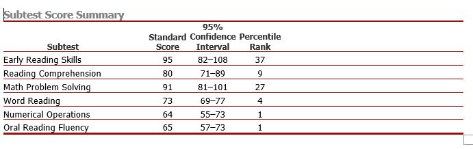 Although Maddie’s reading has improved tremendously her reading speed is still slow and not on par with her age group yet. However, when she reads untimed, her comprehension is on par, according to the WIAT-III Reading Comprehension subtest. This subtest measures untimed reading comprehension of various types of text, including fictional stories, informational text, advertisements, and how-to passages. The student may read the passages aloud or silently. After each passage, the student orally responds to literal and inferential comprehension questions that are read aloud by the examiner. Maddie’s score on this subtest improved from a standard score of 1 (extremely low) to a standard score of 105 (average), or a <1st percentile rank to the 63rd percentile rank!