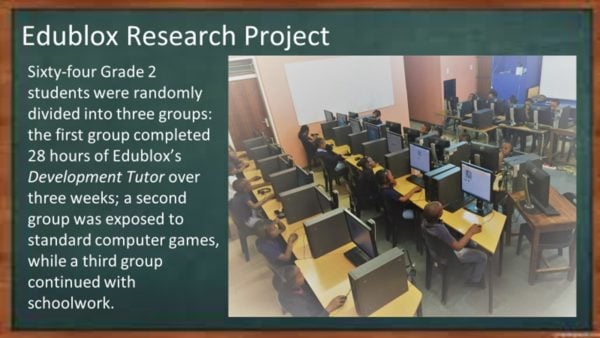 Sixty-four Grade 2 students were randomly divided into three groups: the first group completed 28 hours of Development Tutor over three weeks; a second group was exposed to standard computer games, while a third group continued with schoolwork. The pre- and post-assessments were conducted by independent speech and language therapists using the Test of Auditory Processing Skills (TAPS-3). Three subtests were used to assess auditory memory for numbers, words and sentences. Following the project, Edublox supplied access to Development Tutor to all Grade 2’s to adhere to ethical research practices.