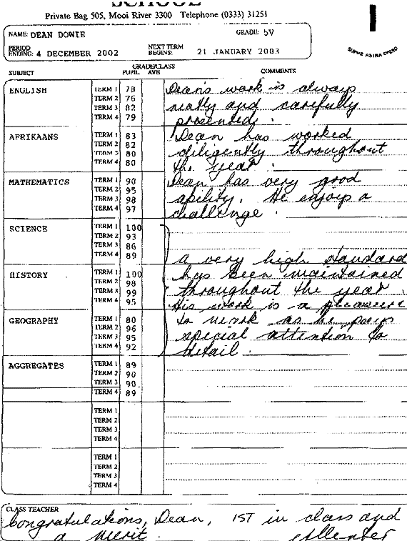 Below is a copy of Dean’s school report at the end of Grade 5. Dean was first in class!!