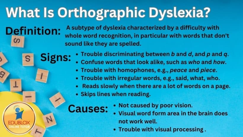 Orthographic dyslexia is a subtype of dyslexia characterized by difficulty with whole word recognition, in particular with words that don’t sound like they are spelled. In this article, we discuss what orthographic dyslexia looks like, how it differs from other dyslexia types, and its causes.